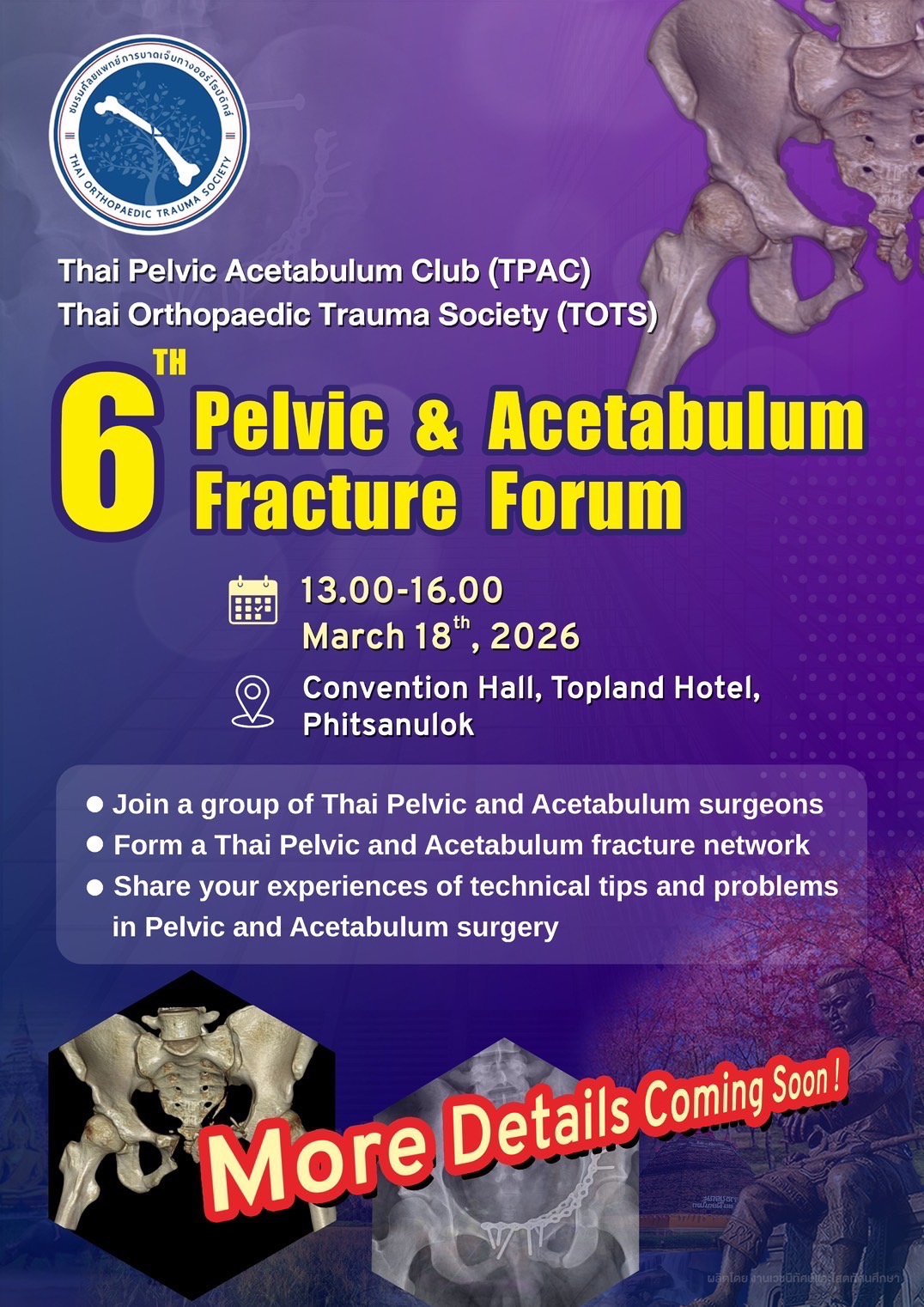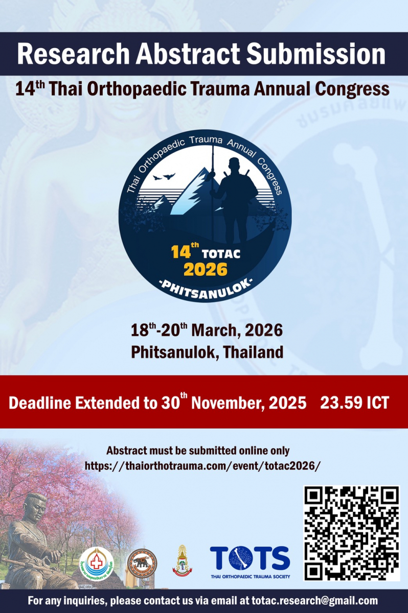 On behalf of the Organizing Committee of the TOTAC Annual Meeting 2026 (in collaboration with Department of Orthopaedics, Buddhachinaraj Hospital and Department of Orthopaedics, Faculty of Medicine Naresuan University), I am honored to extend an invitation to you to attend the 14th Thailand Orthopaedic Trauma Annual Conference (TOTAC 2026), which will be held at the Topland Hotel & Convention Centre, Phitsanulok Province, from March 18th–20th, 2026.